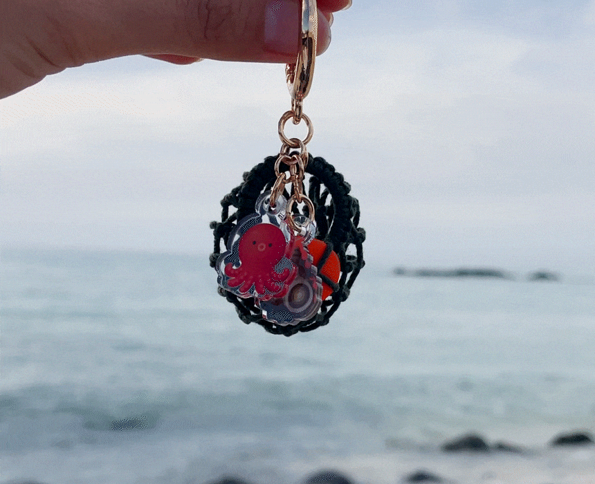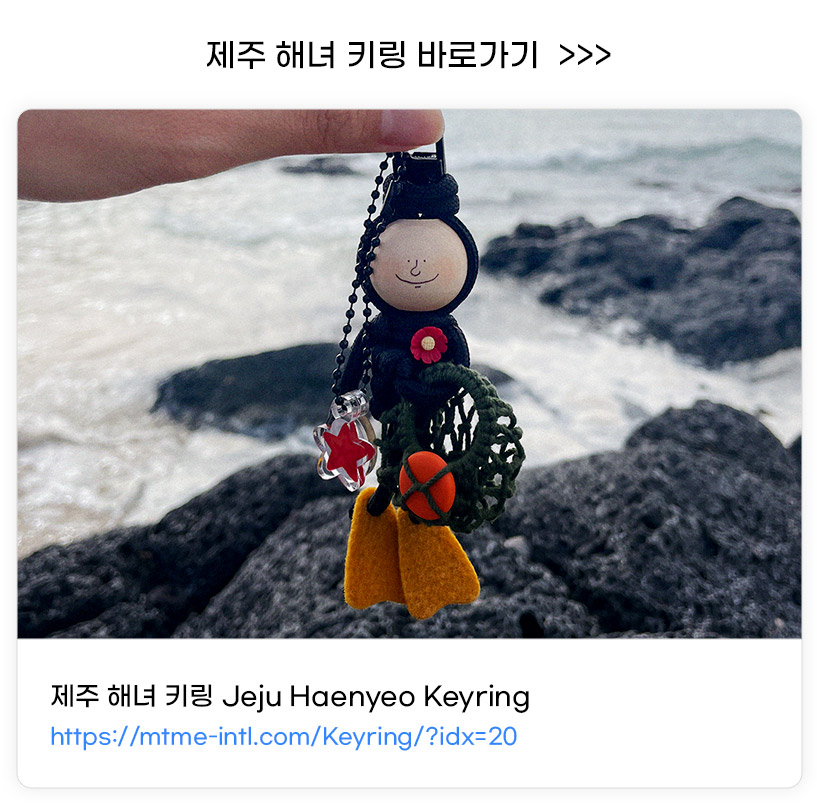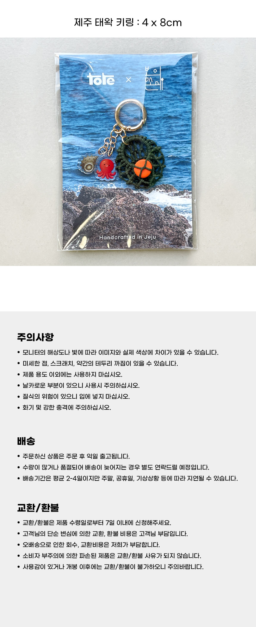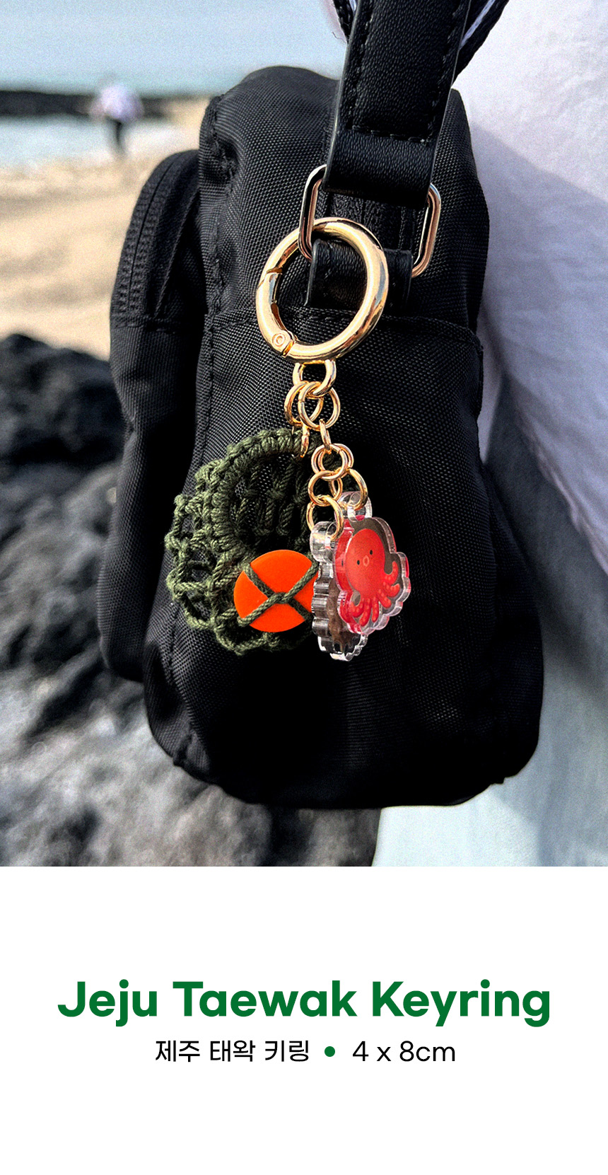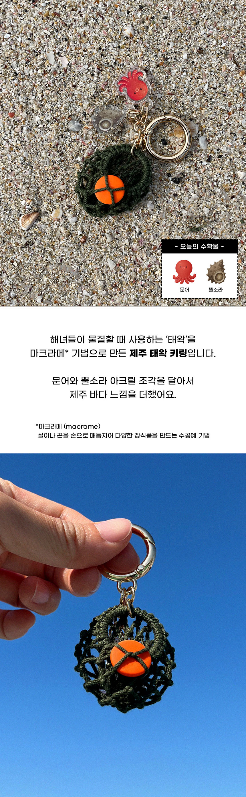 해녀들이 물질할 때 사용하는 ‘태왁’을 마크라메 기법으로 만든 제주 태왁 키링입니다. 문어와 뿔소라 아크릴 조각을 달아서 제주 바다 느낌을 더했어요.